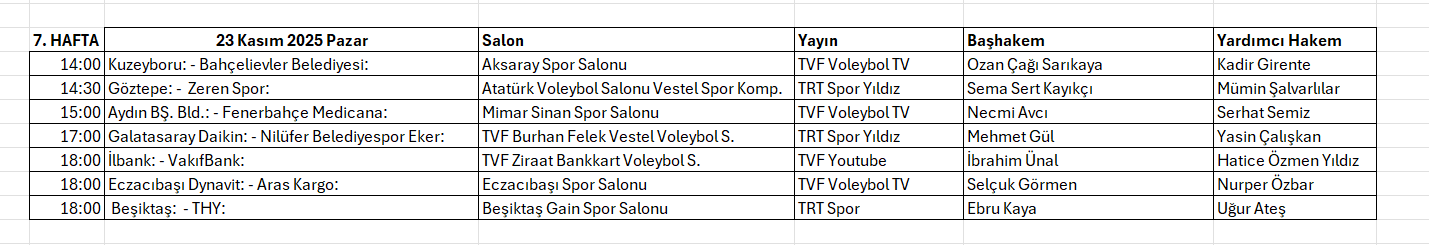 TVF Resmi internet sitesinde açıklanan programa göre 7. hafta maçlarını yönetecek hakemler ve canlı yayın programı şöyle: