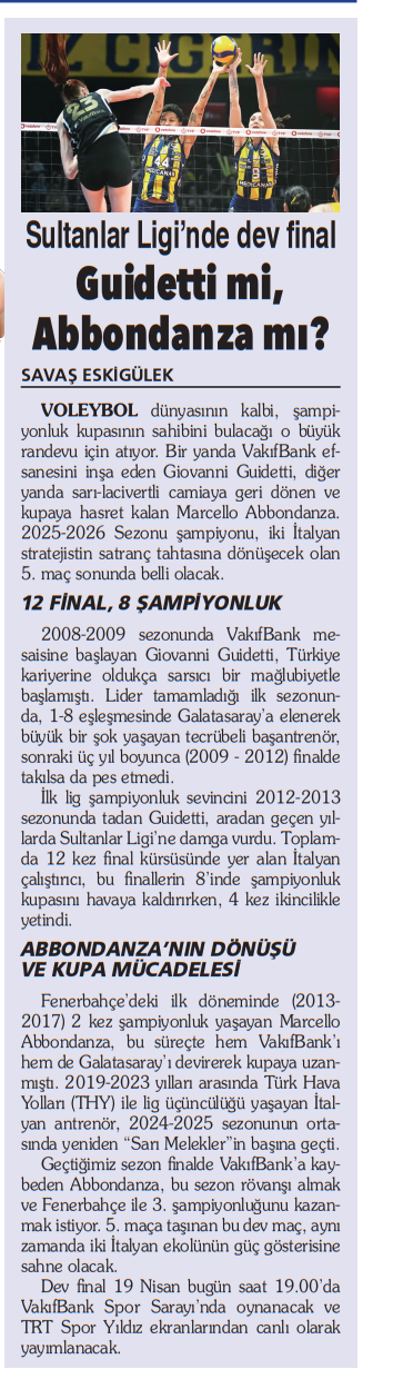 Sultanlar Ligi’nde Dev Final: Guidetti mi, Abbondanza mıVoleybol dünyasının kalbi, şampiyonluk kupasının sahibini bulacağı o büyük randevu için atıyor. Bir yanda VakıfBank efsanesini inşa eden Giovanni Guidetti, diğer yanda sarı-lacivertli camiaya geri dönen ve kupaya hasret kalan Marcello Abbondanza