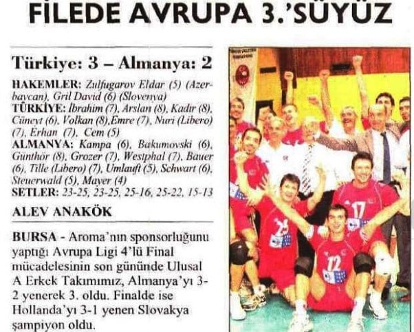 ikinci gün oynanan üçüncülük/dördüncülük müsabakasında Almanya'yı 3-2 yenen (23-25, 23-25, 25-16, 25-22, 15-13 sayılarla) Fausto POLIDORI'nün antrenörlüğünü yaptığı millilerimiz finalleri 3.olarak tamamladı ve bronz madalya aldı.