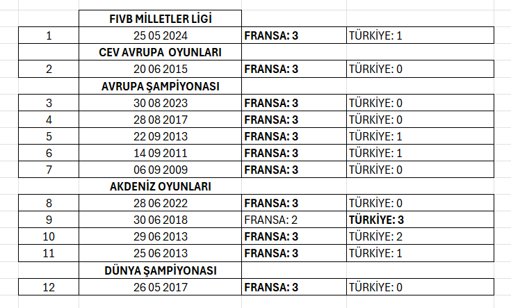 Geride kalan 12 maçta Fransa'nın 11-1 üstünlüğü bulunuyor. Fransa karşısındaki tek galibiyetimizi İspanya'nın Taragona kentinde düzenlenen 2018 Akdeniz Oyunları'nda 3-2'lik skorla almıştık.