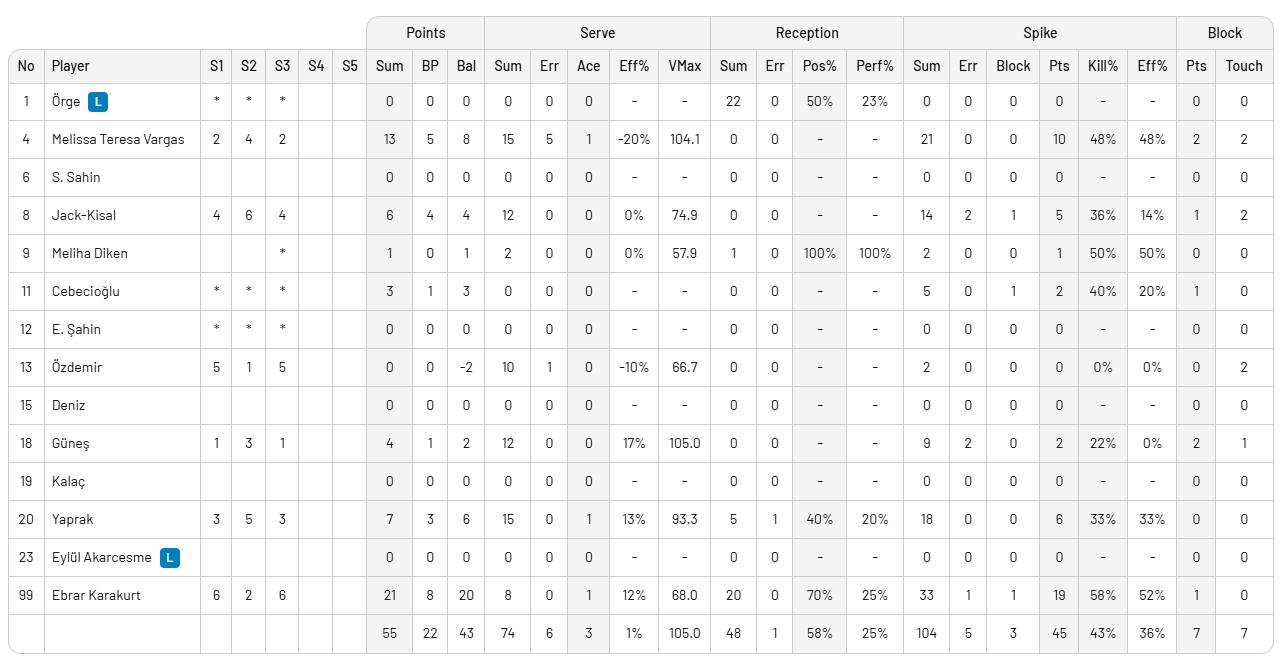 İlk sette Ebrar 7 sayı ile en skorer oyuncumuz oldu. Vargas 5, Yaprak 2, Jack Kısal 3, Derya 2 sayı ile ilk setin kazanılmasında etki yaptılar.