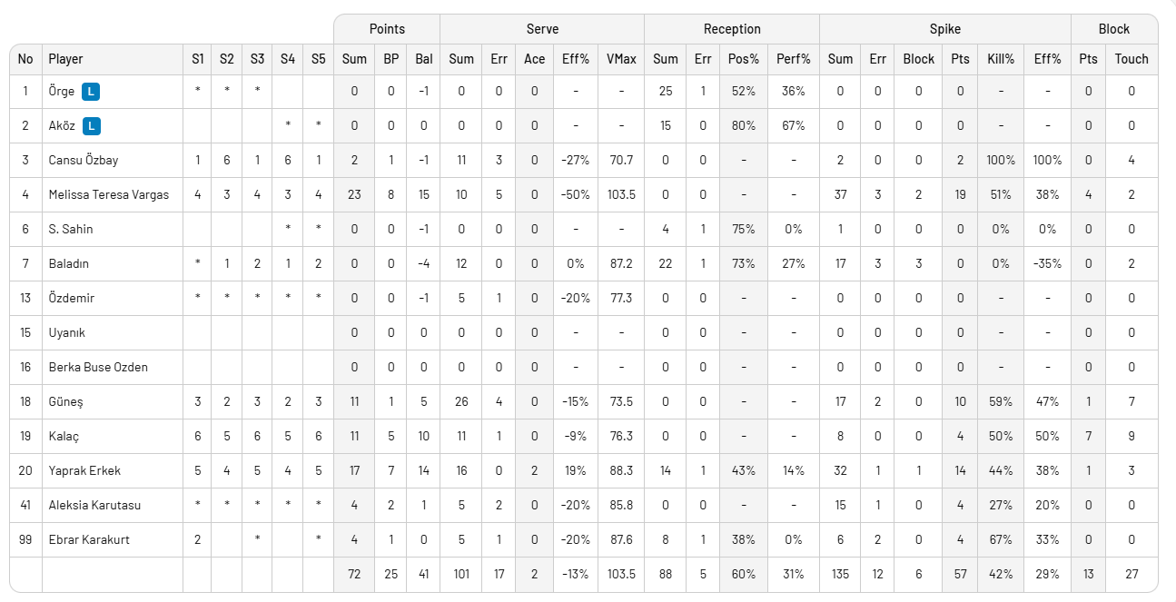 Karşılaşmanın ilk setinde ataktan 13 sayı ve 2 blok sayısı ile oynayan Milli Takımımız direkt hatadan rakibine 11 sayı verdi. Vargas 5, Zehra ve Ebrar 3'er sayı ile oynadılar.