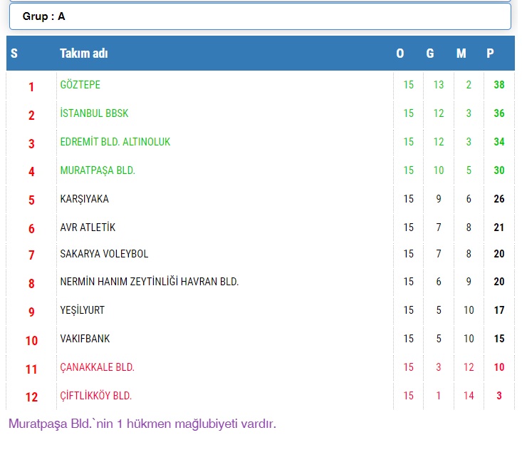 TVF Kadınlar 1. Ligi’nde 15. hafta, 22 Ocak Pazar günü oynanan karşılaşmalarla sona erdi. Günün sonuçları şu şekilde: A GRUBUMAÇ SONUCU SETLER Göztepe – Vakıfbank: 3-0 25-17, 25-17, 25-18 İstanbul BBSK – Çanakkale Bld.: 3-0 27-25, 25-18, 25-18