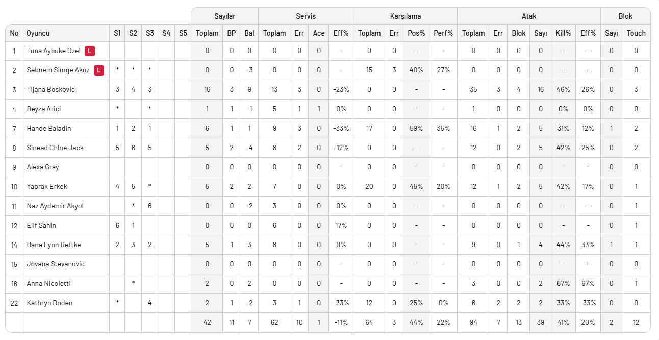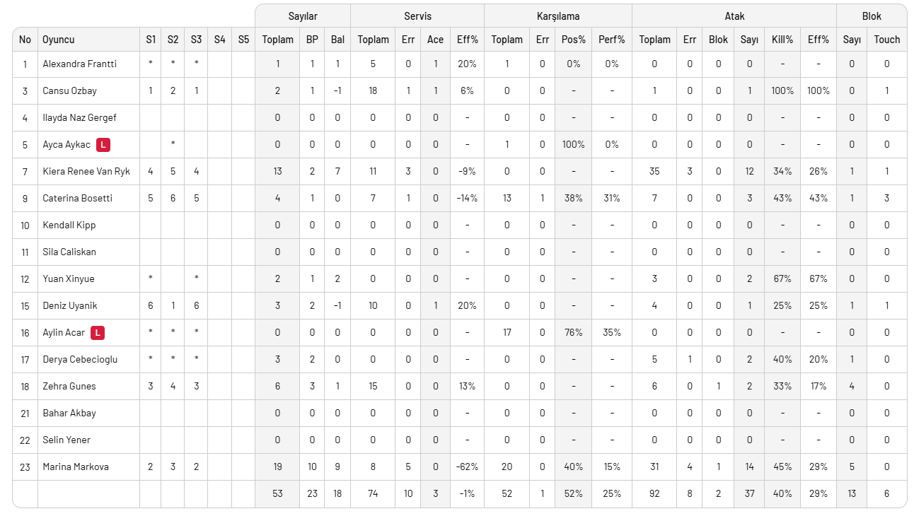 VakıfBank: Cansu, Markova, Zehra, Van Ryk, Bosetti, Deniz, Aylin (L), Ayça (L), Yuan, Derya,