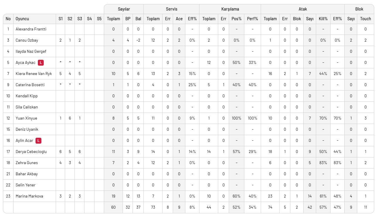 GALATASARAY DAİKİN: İlkin Aydın 10, Yasemin Güveli 3, Alexia Karutasu 7, Katarina Lazovic 9, Eline Timmerman 4, Britt Bongaerts 3, Eylül Akarçeşme Yatgın (L)