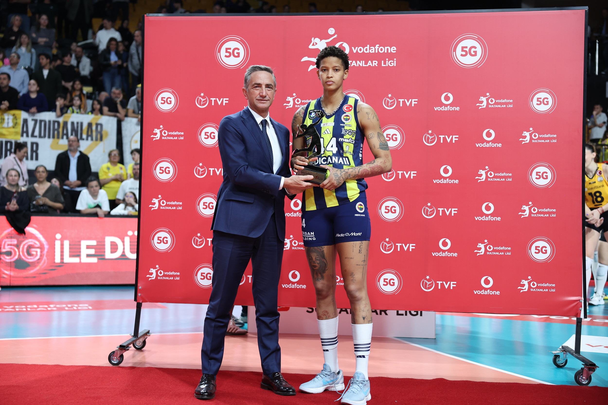 Vodafone Sultanlar Ligi Final serisinin ilk maçında, 5G destekli Şahin Gözü sistemiyle ölçülen veriler ışığında sezonun en hızlı servisi belirlendi. 111,96 km / h hıza ulaşan servisiyle Fenerbahçe Medicana’dan Melissa Vargas, bu kategoride zirvenin sahibi oldu. Vargas, ödülünü Vodafone Türkiye CEO’su Engin Aksoy’dan aldı.