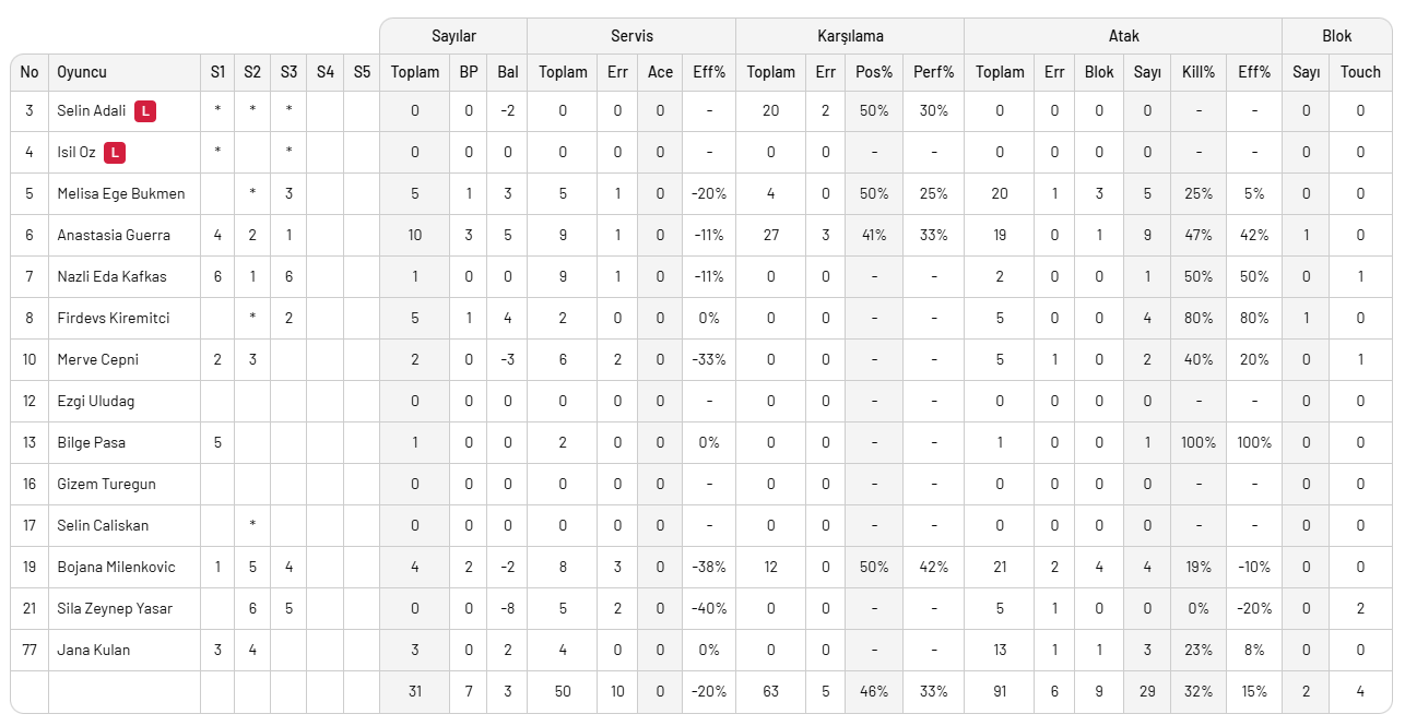 NİLÜFER BLD.: Bojana Milenkovic 4, Merve Çepni 2, Jana Kulan 3, Anastasia Guerra 10, Bilge Paşa 1, Nazlı Eda Kafkas 1, Selin Adalı (L), Ege Melisa Bükmen 5, Firdevs Kiremitçi 5