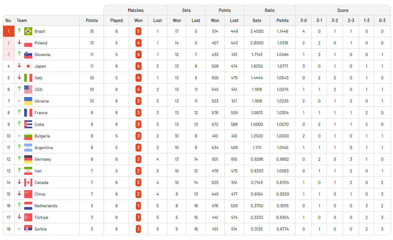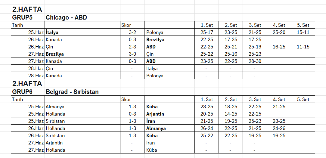 Oynanan maçların ardından VNL'de puan durumu şu şekilde oluştu: