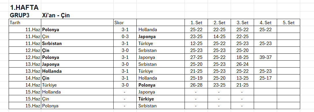 2025 FIVB Milletler Ligi’nde (VNL) heyecan 14 Haziran Cumartesi günü oynanan maçlarla devam etti. Üç grup halinde üç farklı ülkede oynanacak olan 1. Etap maçlarında üçüncü gün tamamlandı. 18 takımın mücadele ettiği VNL’de üç hafta sonunda puan cetvelinde ilk 8 sırada yer alan takımlar finallerde mücadele etme hakkı kazanacak. 4 Konfederasyon 18 takımın yer aldığı Milletler Ligi’nde final etabı karşılaşmaları 30 Temmuz-3 Ağustos 2025 tarihlerinde Çin’in Ningbo kentindeki Beilun Spor Salonu’nda oynanacak. Voleybolseverler Final etabı da dahil toplam 116 maçlık maratonda takımların kıyasıya mücadelesini tanıklık ediyorlar. Erkekler 2025 VNL’de ilk 4 günde oynanan maçlarda alınan sonuçlar ve 15 Haziran Pazar günü oynanacak maçların programı şöyle: