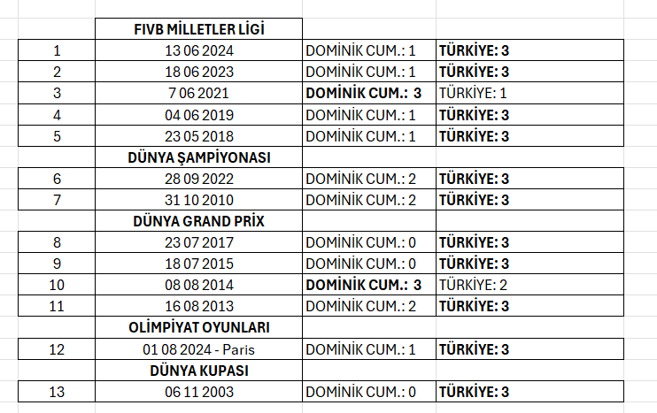 Dominik Cumhuriyeti ile 2018 yılından bu yana oynanan VNL’de 5 kez karşılaşan Filenin Sultanları bu maçların dördünü kazandı, birini kaybetti. Milli Takımımız, kazandığı 4 maçı da 3-1 kazandı.