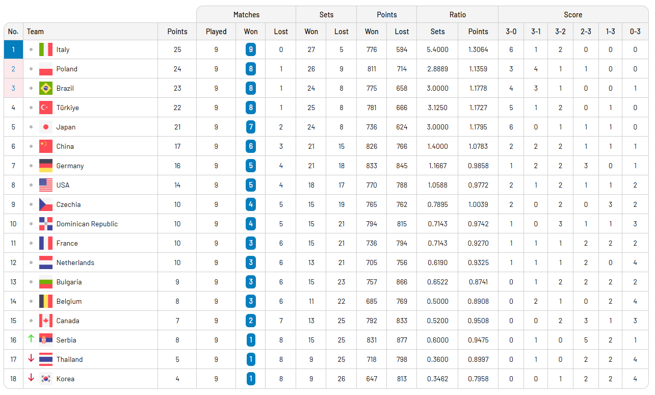 İtalya 9. maçını da kazanırken, Brezilya, Polonya, Türkiye ve Japonya Final Etabında mücadele etmeyi garantilediler. Filenin Sultanları, üst üste yedinci kez Milletler Ligi’nde finallerde yer alacak.