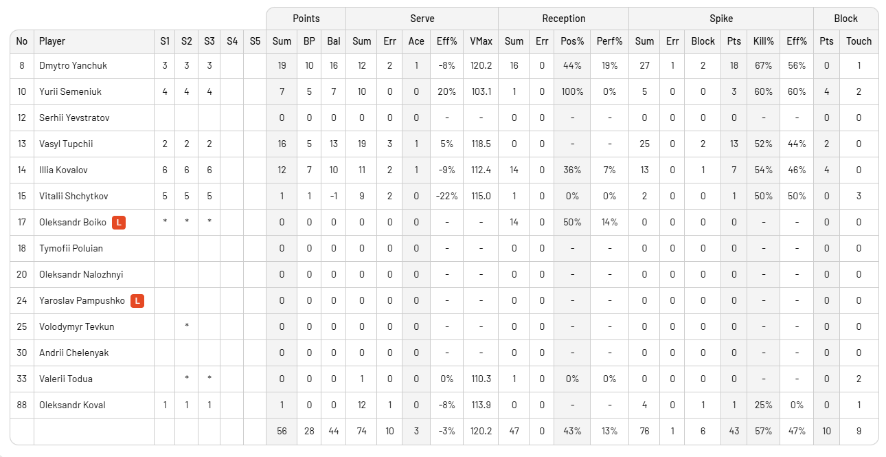 Her iki takımın da servisten sayı bulmadığı ilk sette Yanchuk, Semeniuk ve Kovalov'un 5'er sayısı setteki en önemli faktördü. Ukrayna hücumda %64 ile sayı bulurken, Millilerimizde bu oran %31'de kaldı.
