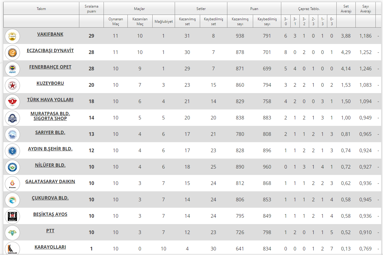 Vodafone Sultanlar Ligi’nde 10. hafta, 26 Kasım Pazar günü oynanan Muratpaşa Bld. Sigorta Shop-Kuzeyboru karşılaşmasıyla sona erdi. Haftanın kapanış mücadelesini kazanan taraf 3-2’lik (12-25, 27-25, 12-25, 25-18, 16-14) skorla ev sahibi Muratpaşa Bld. Sigorta Shop oldu. Ligde 10. haftanın ardından puan durumu şu şekilde oluştu:
