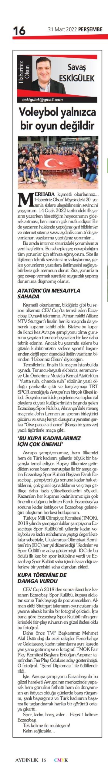 İşte, Avrupa Şampiyonu Eczacıbaşı da bu güzel hareketi Avrupa’nın merkezinde yaparak hem gönülleri fethetti hem de dünyamızın en ihtiyacı olduğu günlerde BARIŞ rüzgarını, şanlı bayrağımız ve Türk Kadınının başarısı ile taçlandırarak harika bir görüntü ortaya çıkarttı.