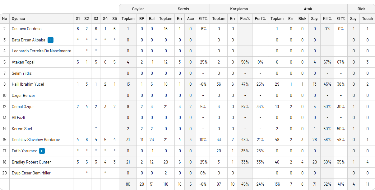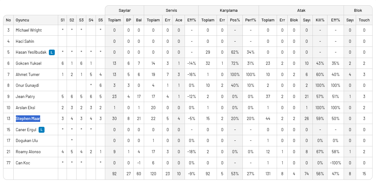 Maçta 8 blok, 74 hücum, 10 servis sayısı ile rakibinin direkt hatasında bulduğu 29 sayı ile 2 puanı hanesine yazdıran sarı kırmızılılarda Stephen Maar 30, Jean Patry 23, Gökçen Yüksel ve Ahmet Tümer 13'er sayı ile çift haneli sayılarda katkı yaparak Galatasaray'ı zirve yarışında tutan performans sergilediler.