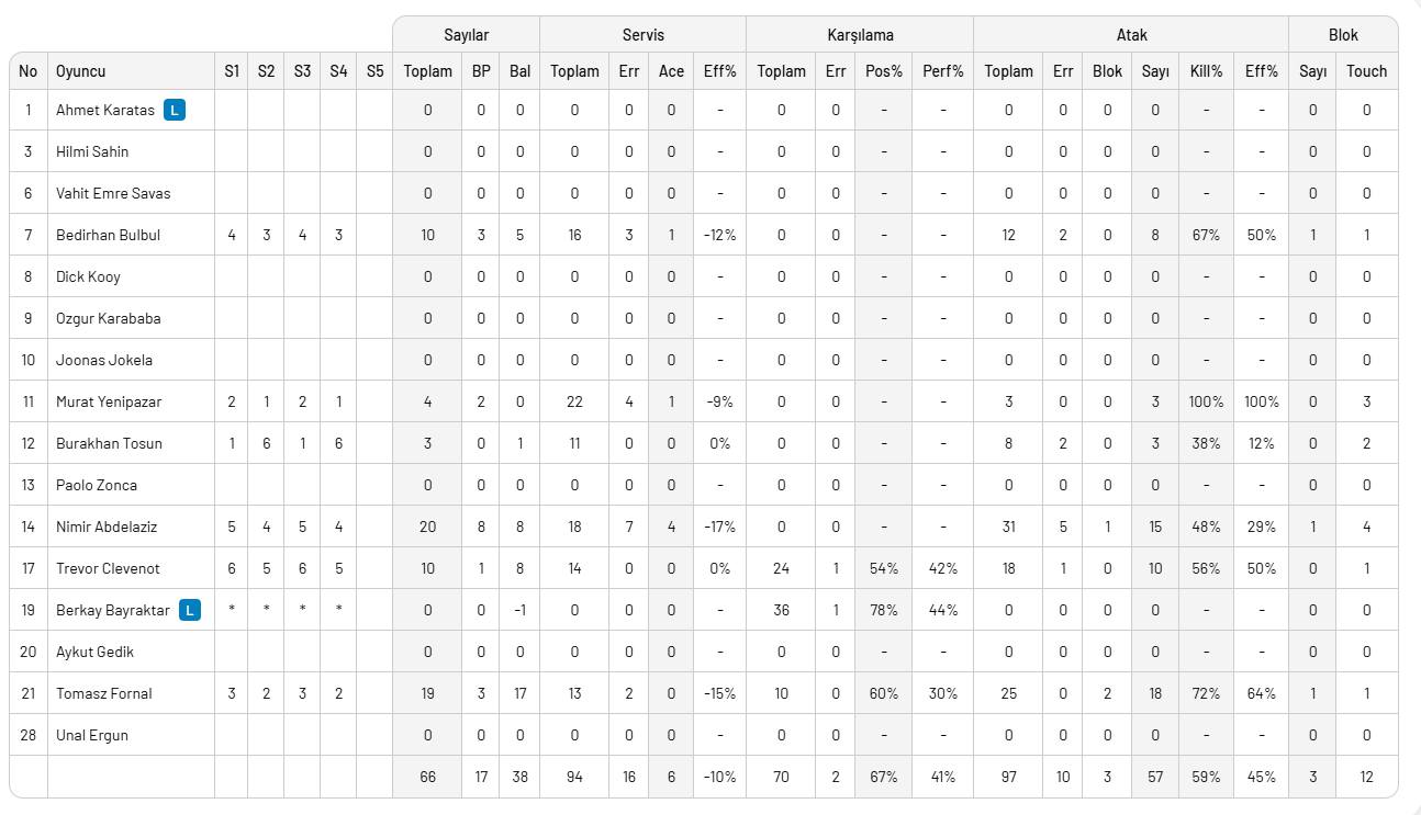 Maç boyunca toplam 3 blok, 57 hücum ve 6 servis sayısı üreten Ziraat Bankkart, rakip hatalarından gelen 29 sayı ile hanesini güçlendirdi. Ev sahibi ekipte Nimir 20 sayıyla yıldızlaşırken; Fornal 19, Bedirhan 10 ve Clevenot 10 sayılık katkılarıyla galibiyetin mimarları oldular.