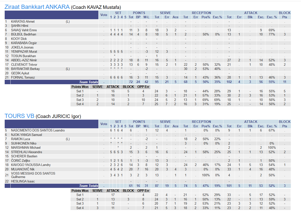 Karşılaşmanın 3. setinde konuk ekip 10 hata ile direkt sayı kaptırdı. Blok yapamayan ve iyi servis kullanamayan Tours karşısında Vahit Emre, Nimir ve Bedirhan buldukları 4'er sayı ile setin kazanılmasına katkı yaptılar.