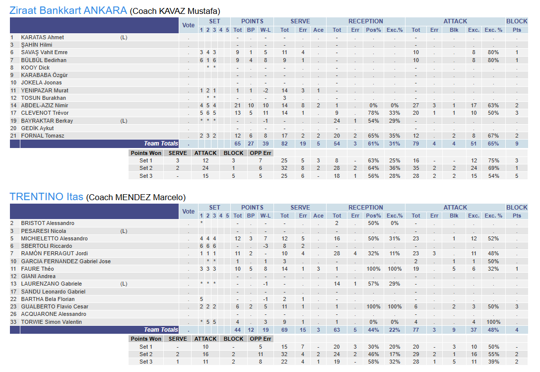 ZİRAAT BANKKART: Emre Savaş, Bedirhan Bülbül, Murat Yenipazar, Nimir Abdelaziz, Trevor Clevenot, Tomasz Fornal (Berkay Bayraktar(L) Burakhan TosunTRENTINO ITAS: Alessandro Micheletto, Riccardo Sbertoli, Ferragut Ramon, Theo Faure, Bela Bartha, Flavio Gualberto (Gabriele Laurenzano(L) Simon Valenti, Alessandro Bristot, Garcia Fernandez)